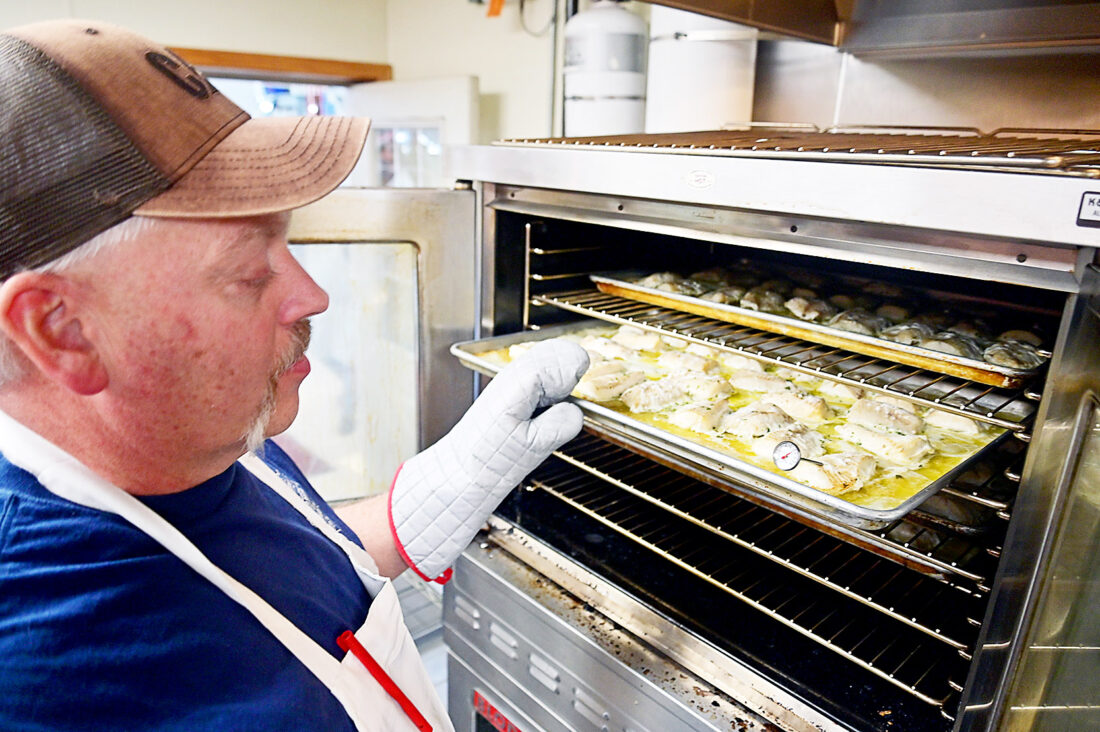 - Excelsior firefighter Joe Whiteford check the temperature of the baked fish in the oven. Mirror photo by Patrick Waksmunski