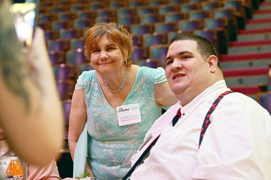 Jamie Stasky and Luke Hullihen have their photo taken together during the Night to Shine event at the Jaffa Shine Center on Friday evening. Mirror photo by Patrick Waksmunski