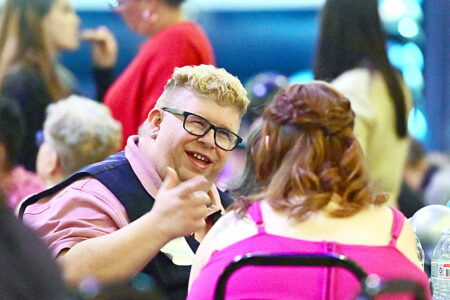 Kenny Gray of Mount Union laughs with girlfriend Kayla Eitnier of Huntingdon during the Night to Shine event at the Jaffa Shine Center on Friday evening. Mirror photo by Patrick Waksmunski