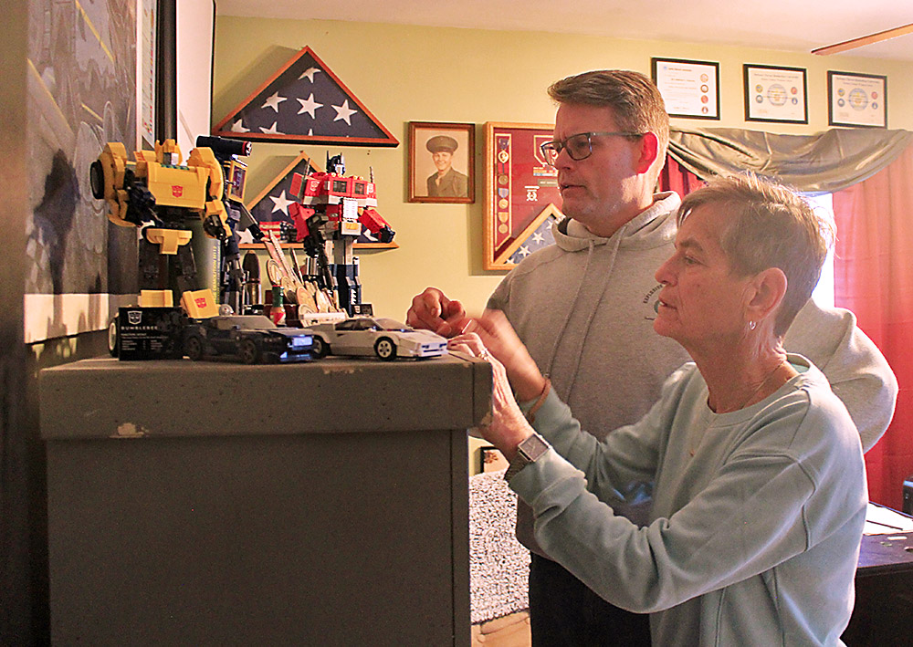 Altoona couple Matthew and Debbi Chapman look at army medals — among other decorative objects — placed on a dresser in their home office. Mirror photo by Colette Costlow