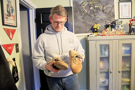 Matthew Chapman looks at the boots he wore during the Iraq invasion, noticing the worn-down tread and dog tag stuck between the laces. Mirror photo by Colette Costlow