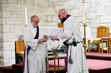 - Saint Therese of the Child Jesus pastor the Rev. Brian Norris (right) and Deacon Thomas McFee prepare to distribute ashes during a noon service at the Altoona parish on Ash Wednesday, the first day of Lent. Mirror photo by Patrick Waksmunski
