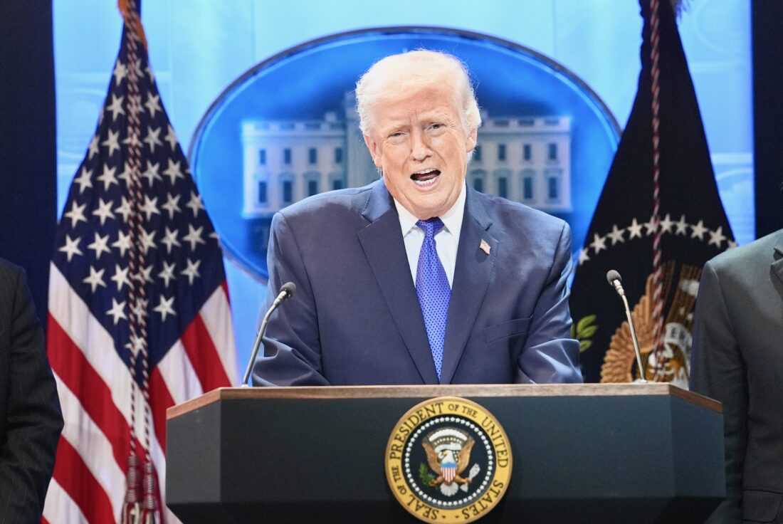 The Associated Press / President Donald Trump speaks during a press briefing at the White House Friday following the Supreme Court’s ruling on tariffs.