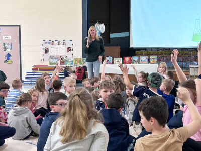 Children’s author Sue Fliess answers a question from Frankstown Elementary first grader Reese Humes during her appearance at the school Tuesday in Hollidaysburg. Fliess, author of more than 60 books, shared her experiences as a published author with kindergarten through second grade students.