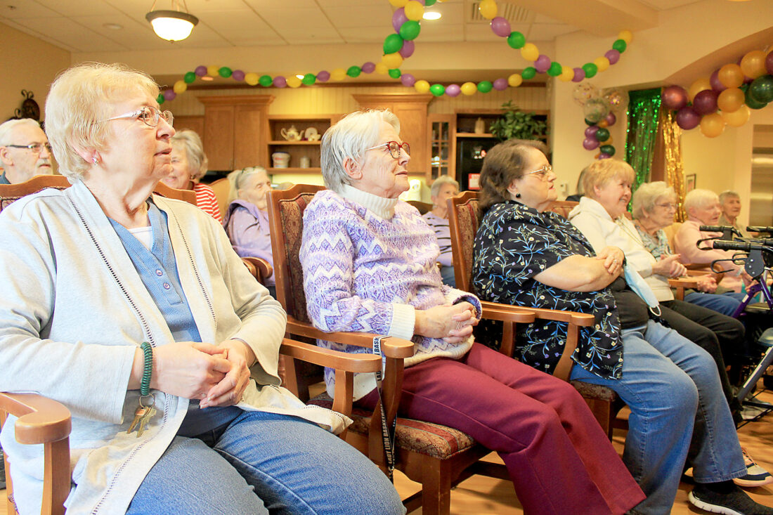 Nursing home resident Joan Noonan (left) sits with audience members while local entertainer Ricky Howsare sings songs. Mirror photo by Colette Costlow