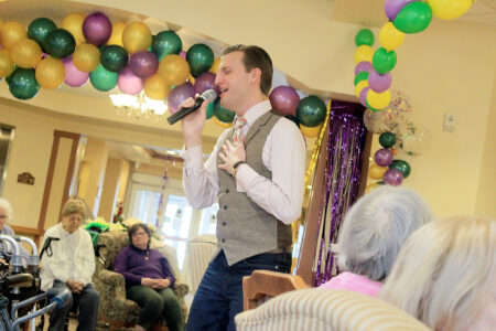 Local entertainer Ricky Howsare sings to nursing home residents on Mardi Gras. Howsare, 31, has been making a positive impact on area nursing home residents by singing their favorite songs. Mirror photo by Colette Costlow