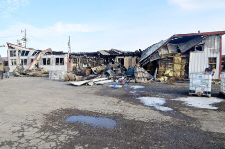 A fire early Saturday destroyed a pair of attached barns at the Frederick Dairy Farm in Martinsburg RD. Mirror photo by Patrick Waksmunski
