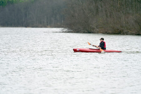 A lone kayaker glides across the lake at Canoe Creek State Park on Monday afternoon.