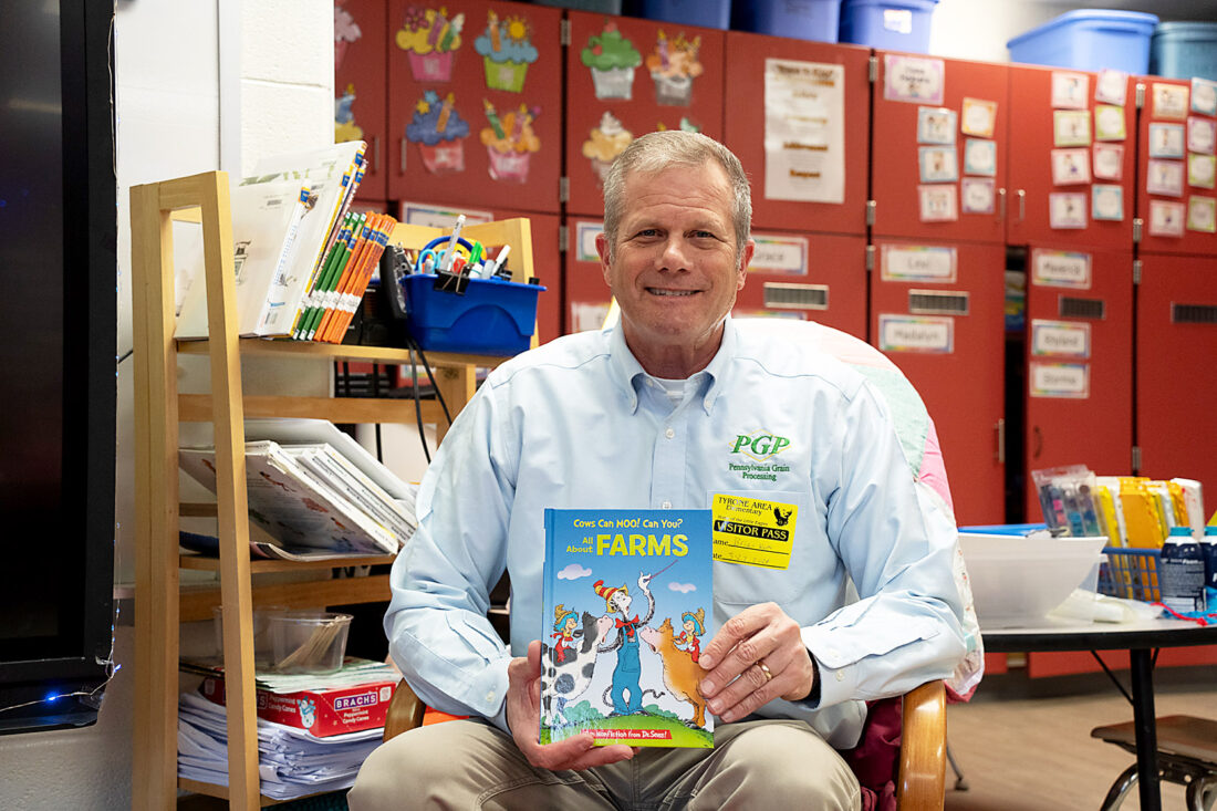 Brian Kelly, a member of the Pennsylvania Friends of Agriculture Foundation board and a corn originator at Pennsylvania Grain Processing LLC, displays the book used at the Ag Literacy Week program at Tyrone Area Elementary School. Courtesy photo