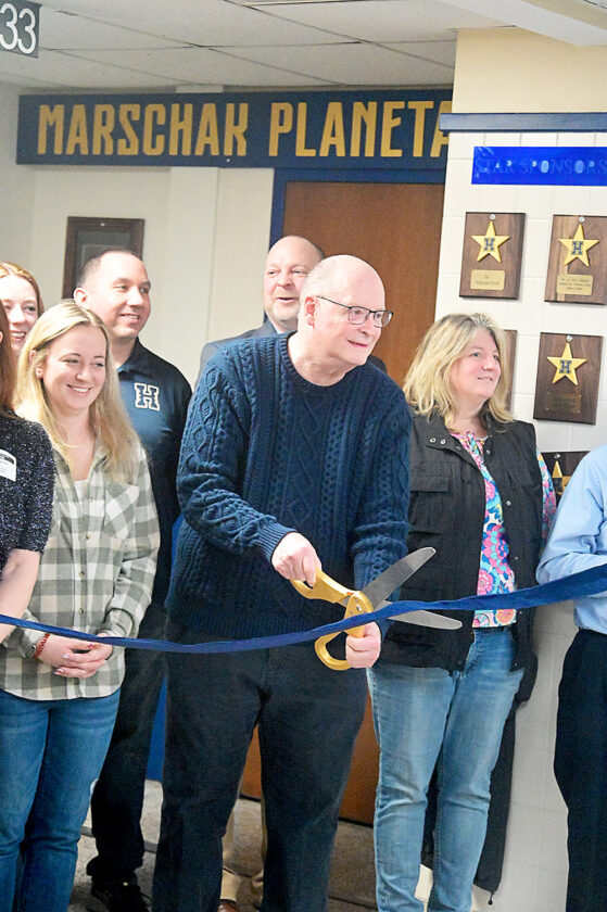 - Former Hollidaysburg Area High School teacher Fred Marschak cuts the ribbon officially dedicating the school’s upgraded planetarium in his honor. Mirror photo by Patrick Waksmunski