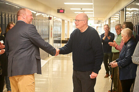- Hollidaysburg Area Senior High School Assistant Principal Kevin McCloskey (left) shakes hands with Fred Marschak during planetarium dedication ceremonies on Friday. Mirror photo by Patrick Waksmunski