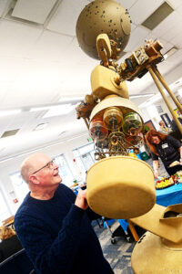 Former Hollidaysburg Area High School teacher Fred Marschak looks at the original planetarium projector on display at the school’s cafeteria during a luncheon that followed the ribbon cutting of the Marschak Planetarium on Friday. Mirror photo by Patrick Waksmunski