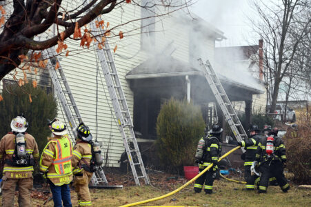 Mirror photo by Patrick Waksmunski / Area volunteer firefighters battle a house fire at 1511 Allegheny St. in Hollidaysburg on Wednesday afternoon.