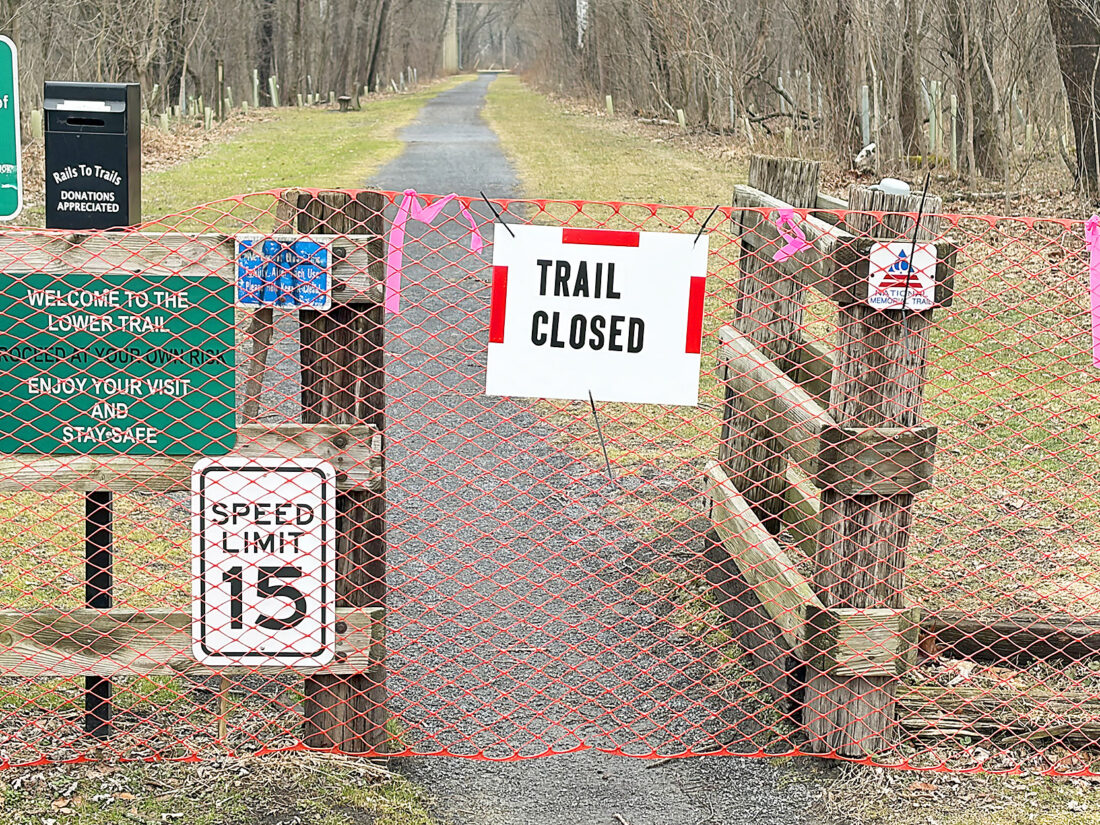 Signs warn Lower Trail users that the trail is temporarily closed. The closure runs from the Alfarata trailhead near Alexandria for about 0.7 miles to the area behind the Water Street Flea Market. Penelec has closed that portion of the trail while it completes a nearby project. Mirror photo by Walt Frank