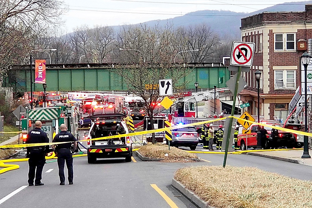 Emergency personnel work at the site of a deadly explosion at a chocolate factory in West Reading on March 25, 2023. Reading Eagle file photo by Michelle Lynch via AP
