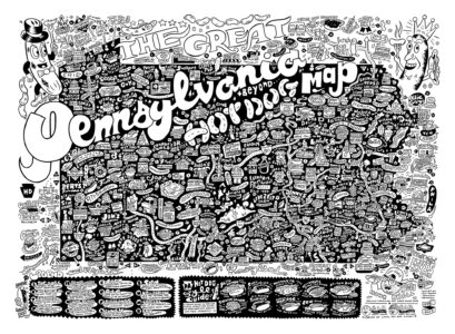 - The Great Pennsylvania Hot Dog Map, a custom illustration of the state’s many franks and where to find them. Courtesy of Hawk Krall