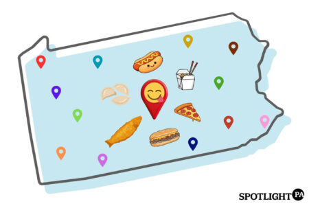 - Illustration of Pennsylvania with select food items and location pins placed across the state. Asha Prihar / Spotlight PA