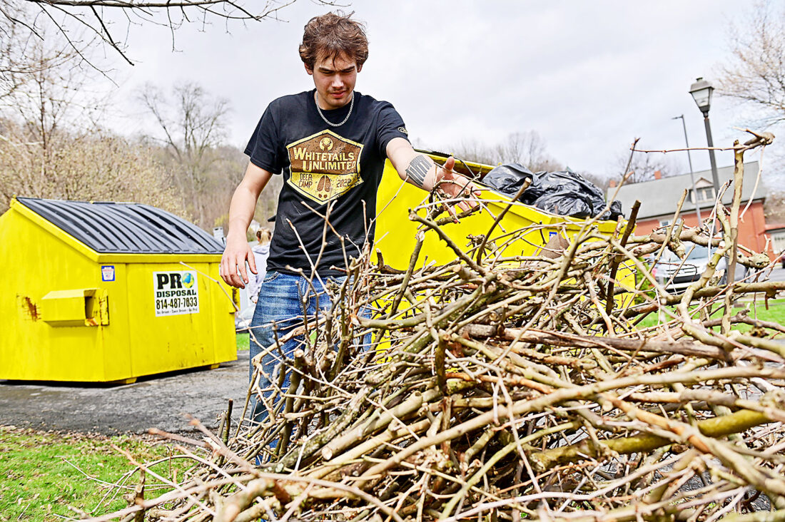 - Tyrone Area High School senior Austin Beamer adds branches to the pile while cleaning up around Cedarwood Rehabilitation and Healthcare Center in Tyrone as part of the school’s annual community service day. Mirror photo by Patrick Waksmunski