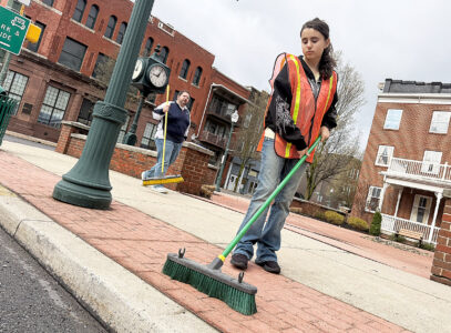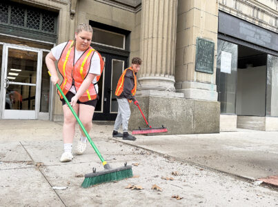 Tyrone Area freshman Emery Cole sweeps the sidewalk Wednesday near City Hotel Park as chemistry teacher Mike Funicelli walks by. Mirror photo by Matt Churella