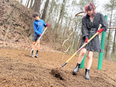 Tyrone Area sophomores Heaven Browing and Gavin Brasher spread mulch Wednesday at a playground near pavilion 12 in Reservoir Park. Mirror photo by Matt Churella