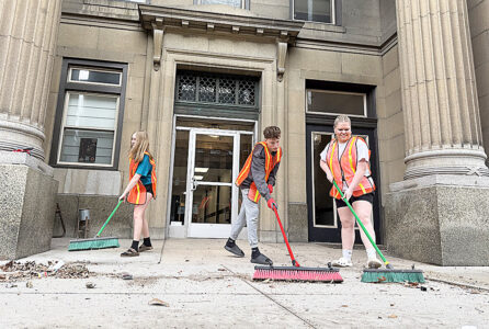 - Tyrone Area freshmen (from left) Nevaeh Eaken, Collin Moore and Maddie Hassenplug sweep the sidewalk along Pennsylvania Avenue during the district’s annual community service project Wednesday. Mirror photo by Matt Churella