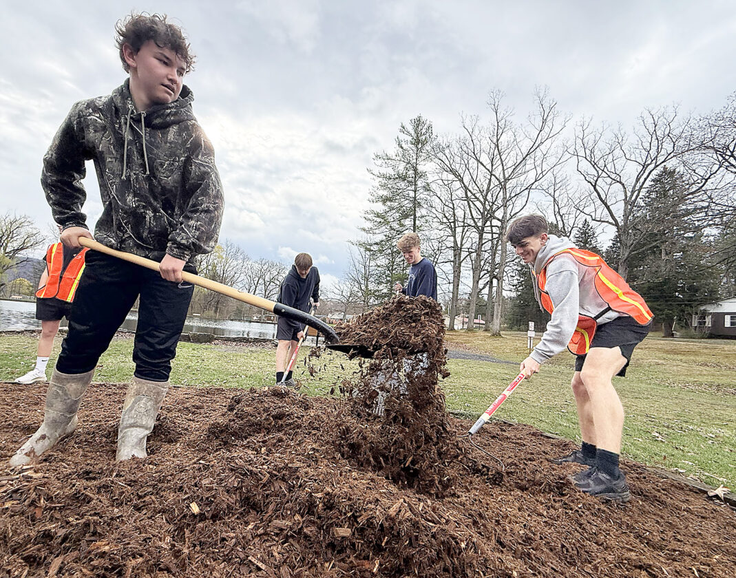 Tyrone Area sophomore Wyatt Jones spreads mulch Wednesday morning at Reservoir Park. Jones said he loved playing at the park when he was younger and was happy to be part of the district's community service project. Although he broke a sweat, anything beats being in school, he said. Mirror photo by Matt Churella