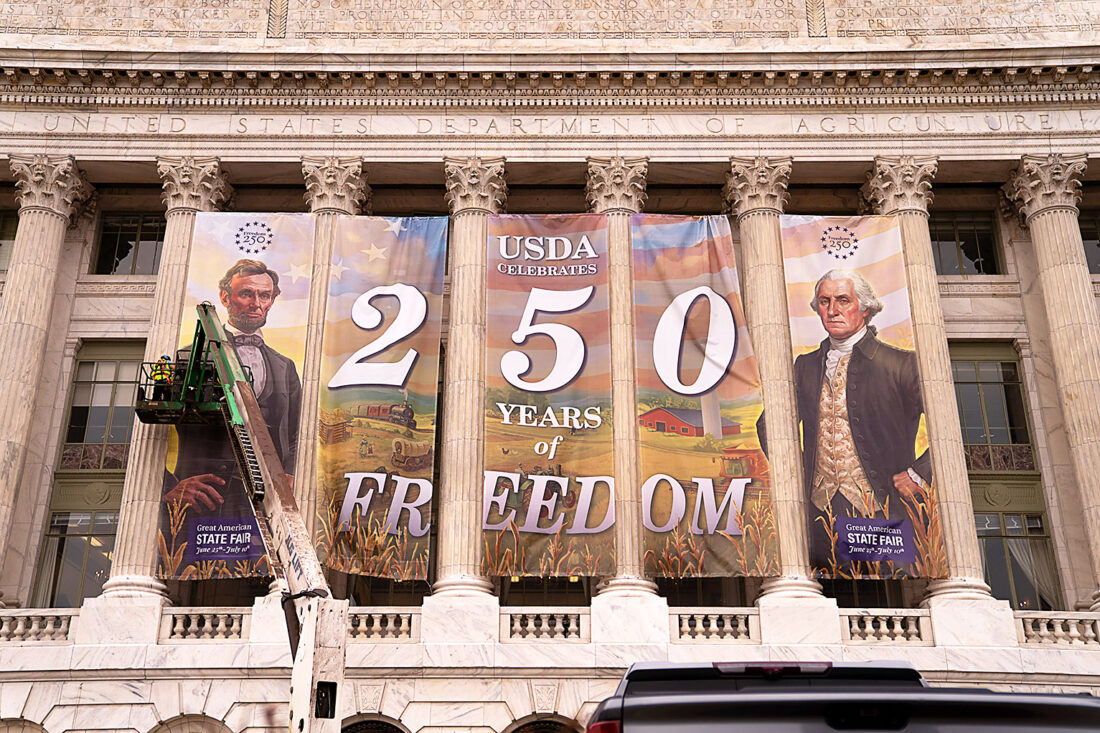 Crews fix the banners in front of the Department of Agriculture on March 20 in Washington. The Associated Press
