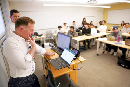 Professor Panos Ipeirotis speaks with an oral AI agent during his class at NYU Stern School of Business March 4 in New York. The Associated Press