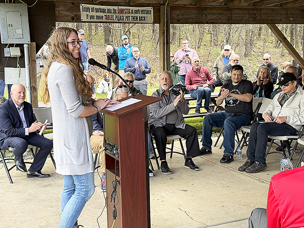 Cambria County Conservation and Recreation Authority Executive Director Cliff Kitner talks about completing the final segment of the Ghost Town Trail’s C&I Extension during a ribbon cutting event Wednesday at the Nanty Glo Park and Pool. Mirror photo by Matt Churella