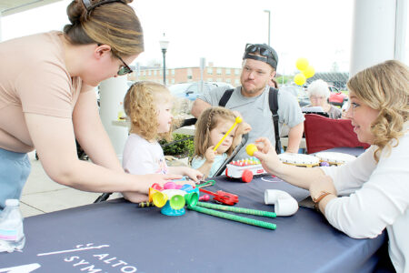 Outside at the Altoona Symphony booth, Scarlett, 4, and Amelia, 2, and their parents Troy and Taylor Benton, of Altoona, stopped to try out the xylophone, triangle and other music-makers.