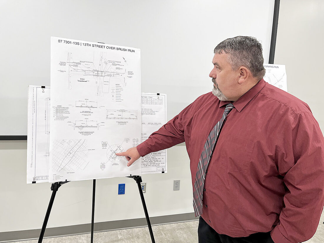 PennDOT civil engineer supervisor Ed Grove points out information on one of four charts set up for a presentation at the city’s Margaret Avenue training facility Tuesday evening on bridge rehabilitations that will take place next year. Mirror photo by William Kibler