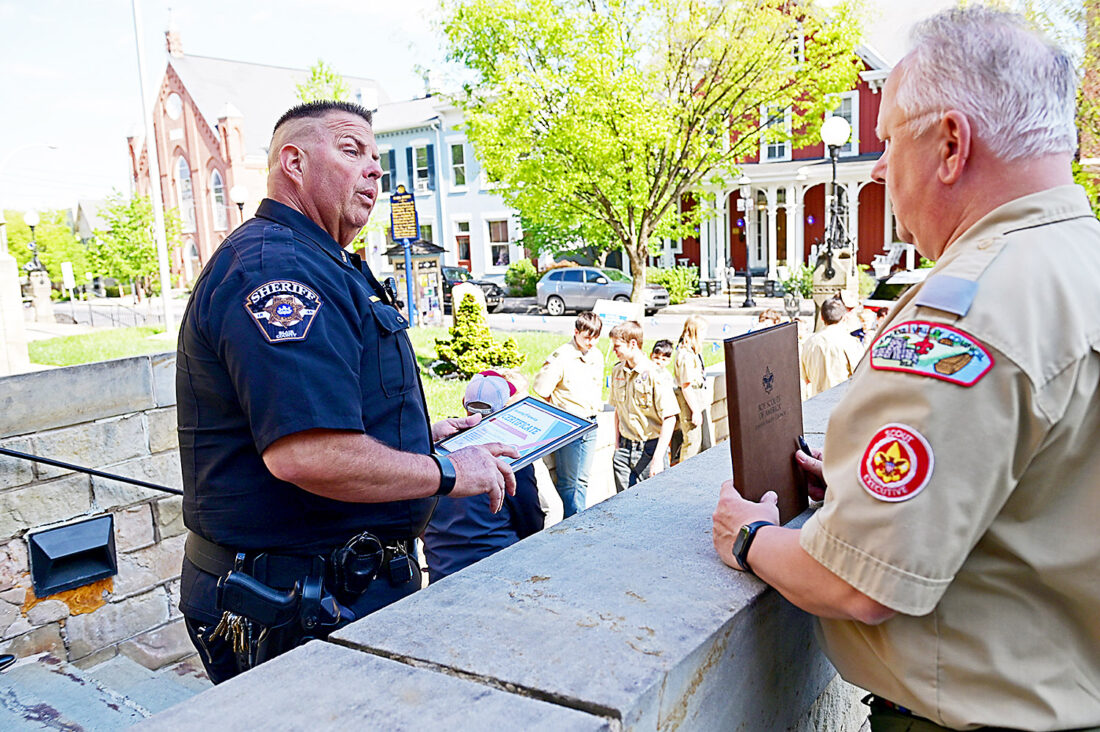 - Blair County Sheriff James Ott (left) was presented a Certificate of Appreciation by Juniata Valley Council of Scouting America Scout Executive Jeff Pickett during the Light to Unite/Flags across the Commonwealth ceremony at the Blair County Courthouse on Tuesday afternoon. Mirror photo by Patrick Waksmunski