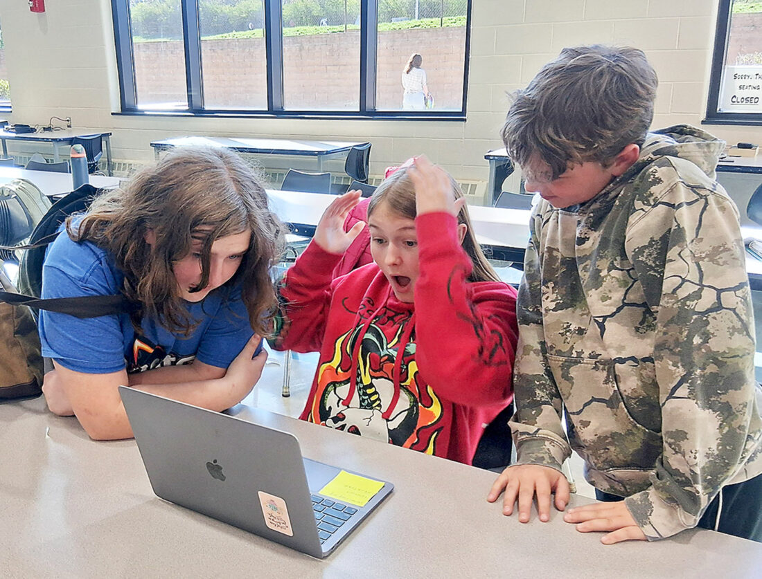 Students (from left) Isobel Feight, Jemma Johnson and Damien Knott of Everett Area Middle School’s What’s So Cool about Manufacturing project edit their video for Everite Door. Voting for Viewer’s Choice opens at midnight Wednesday at www.whatsocool.org. Courtesy photo