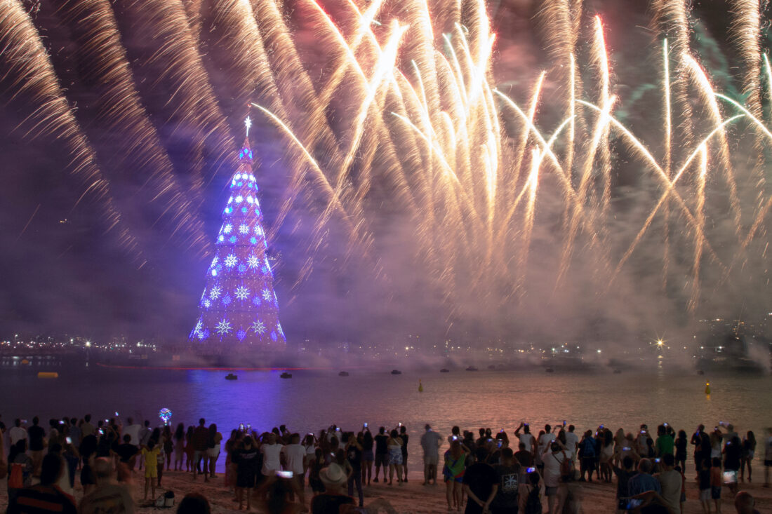Fireworks explode over the floating Christmas tree at Botafogo beach as it is lit for the holiday season in Rio de Janeiro, Sunday, Nov. 30, 2025. (AP Photo/Bruna Prado)