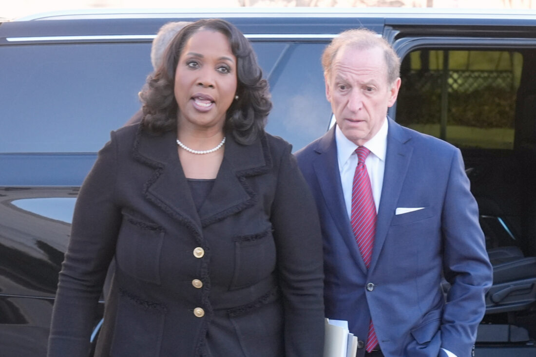 Federal Reserve governor Lisa Cook and attorney Abbe Lowell, arrive at the Supreme Court in Washington, Wednesday, Jan. 21, 2026. (AP Photo/Mark Schiefelbein)