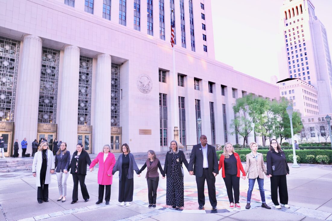 The Associated Press / A group holds hands outside a landmark trial over whether social media platforms deliberately addict and harm children, Wednesday in Los Angeles.