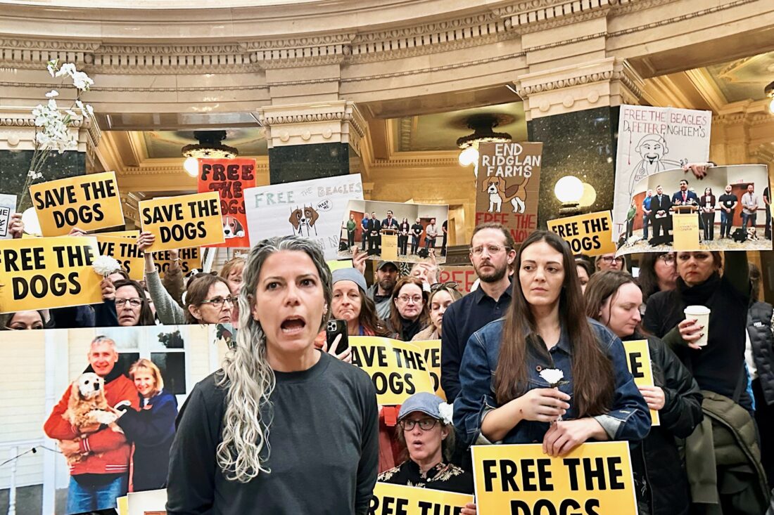 MADISON, Wis. — Animal welfare activists converged outside of Wisconsin Gov. Tony Evers’ Capitol office on Monday, chanting “Free the dogs!” and demanding that the governor and attorney general do what they can to shut down a beagle breeding and research facility where many of the protesters clashed with police two days earlier.