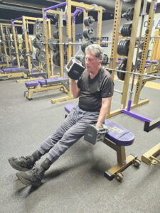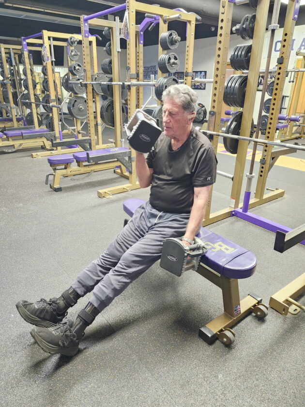He still finds methods to modify his training routines by performing chair yoga and lifting adjustable dumbbells. He also walks the halls of Bishop Guilfoyle and exercises in the weight room a couple times a week.