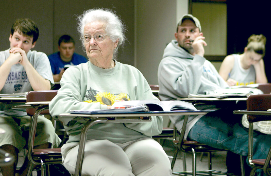 - FILE – In this April 23, 2007 file photo, Nola Ochs listens to a lecture during a class at Fort Hays State University in Hays, Kan. (AP Photo/Charlie Riedel, File)