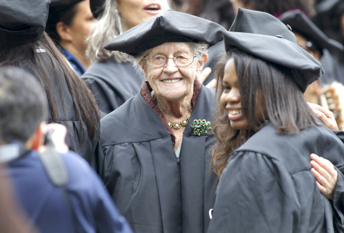 - FILE – Hazel Soares, 94, center, gets her picture taken with some of her classmates before the start of commencement exercises at Mills College, in Oakland, Calif., Saturday, May 15, 2010. ( AP Photo/Tony Avelar, File)