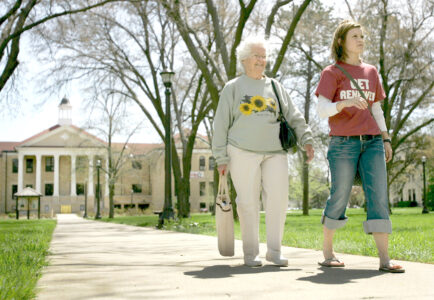 - FILE – Nola Ochs and her granddaughter, Alexandra Ochs, right, walk across the Fort Hays State University campus between classes Monday, April 23, 2007 in Hays, Kan. (AP Photo/Charlie Riedel, File)