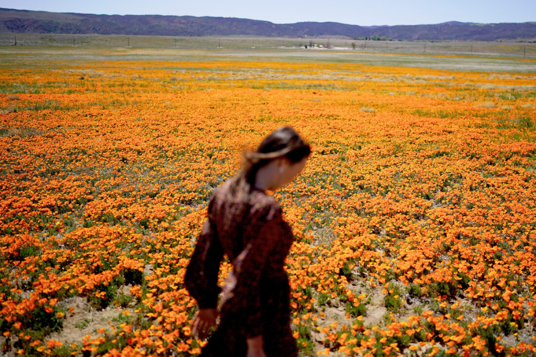 FILE - Elena Ivanov, visiting from San Jose, Calif., walks across a field covered with blooming poppies near the Antelope Valley California Poppy Reserve in Lancaster, Calif., March 30, 2022. (AP Photo/Jae C. Hong, File)