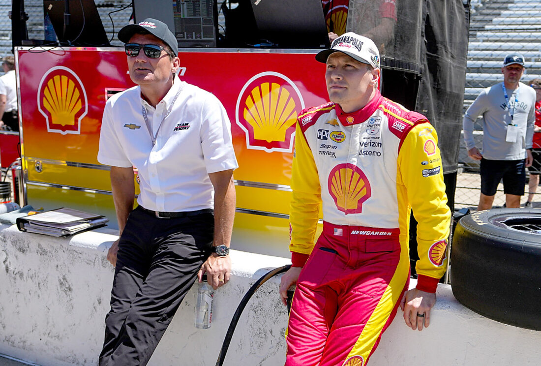 Then president of Team Penske Tim Cindric (left) and driver Josef Newgarden wait for the start of practice for the Indianapolis 500 this past weekend. The Associated Press