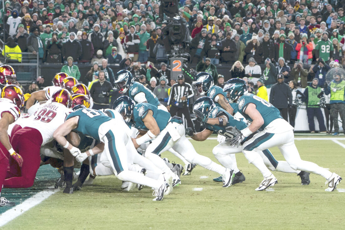Philadelphia Eagles quarterback Jalen Hurts (center) and teammates run the tush push play during a playoff game against the Washington Commanders on Jan. 26 in Philadelphia. The Associated Press