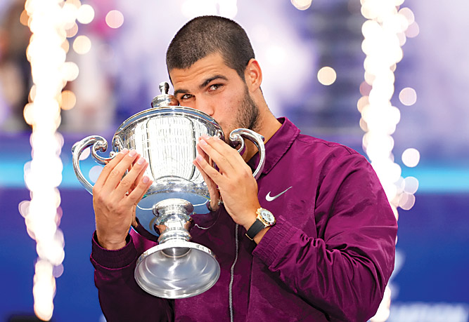 The Associated Press Carlos Alcaraz kisses the championship trophy after winning the U.S. Open men’s singles title Sunday.