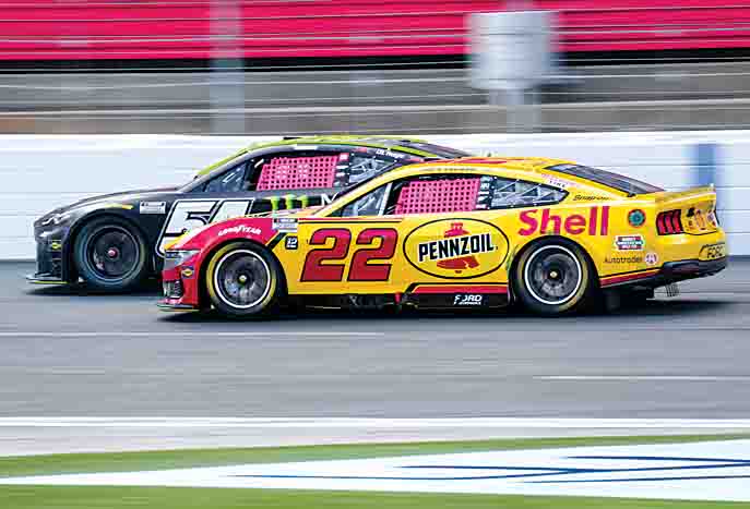 The Associated Press Joey Logano (22) looks to pass Ty Gibbs during a NASCAR Cup Series race in Concord, N.C., Sunday.