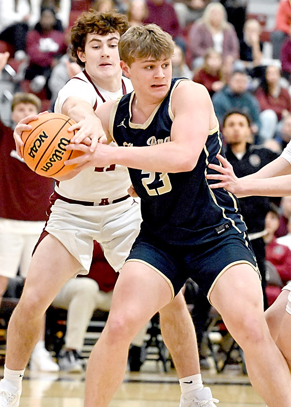 - 12/01/25 Mirror photo by Patrick Waksmunski / Hollidaysburg’s Vince Albarano gets some help from Ben Zimmerman on Altoona’s Chris Wagner.