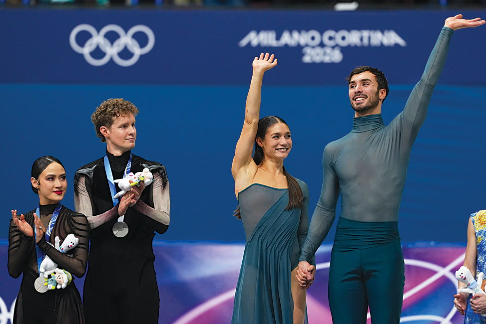 Gold medalists Laurence Fournier Beaudry and Guillaume Cizeron of France wave as silver medalists Madison Chock and Evan Bates of the United States look on after the the ice dancing free skate in figure skating at the 2026 Winter Olympics, in Milan, Italy, Wednesday, Feb. 11, 2026. (AP Photo/Francisco Seco)