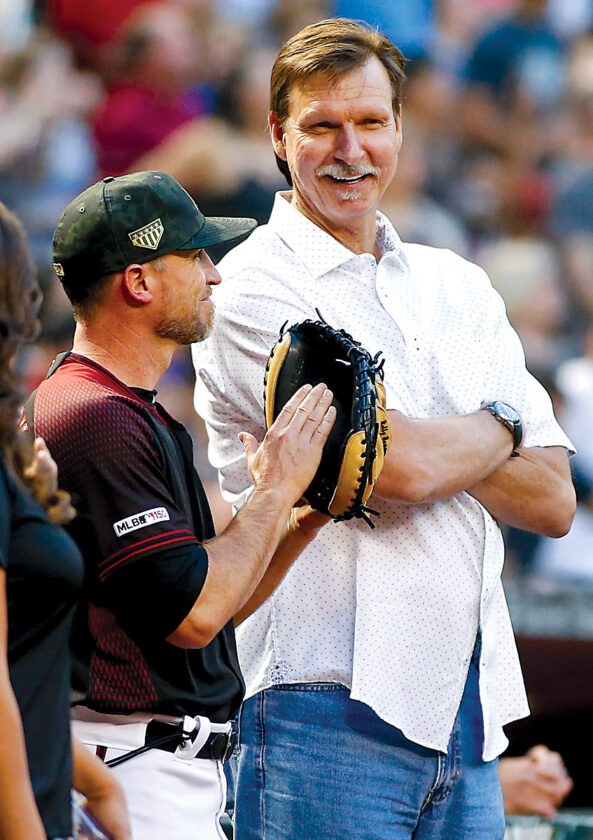 The Associated Press file photo Randy Johnson (right) talks with Robby Hammock before throwing out the first pitch prior to an Arizona Diamondbacks game on May 18, 2019. The D-backs were celebrating the 15th anniversary of Johnson’s perfect game.