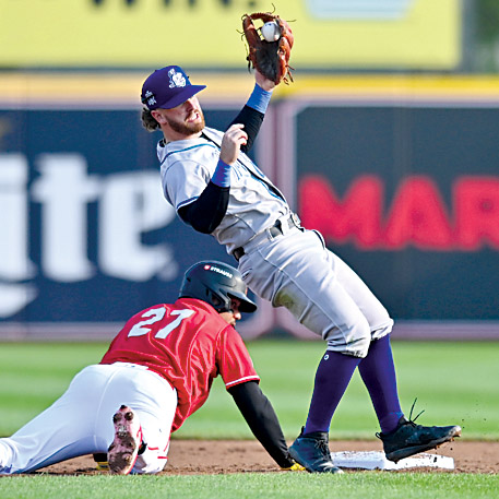- 08/08/25 Mirror photo by Patrick Waksmunski / Curve’s Esmerlyn Valdez is safe as Hartford second baseman Roc Riggio spins on a pickoff attempt.